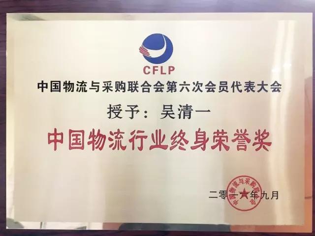 吳清一教授幾十年來為中國物流事業(yè)發(fā)展做出重大貢獻(xiàn),尤其在托盤物流領(lǐng)域取得了矚目的成就,經(jīng)中國物流與采購聯(lián)合會(huì)研究決定,授予吳清一教授“中國物流行業(yè)終身榮譽(yù)獎(jiǎng)”。